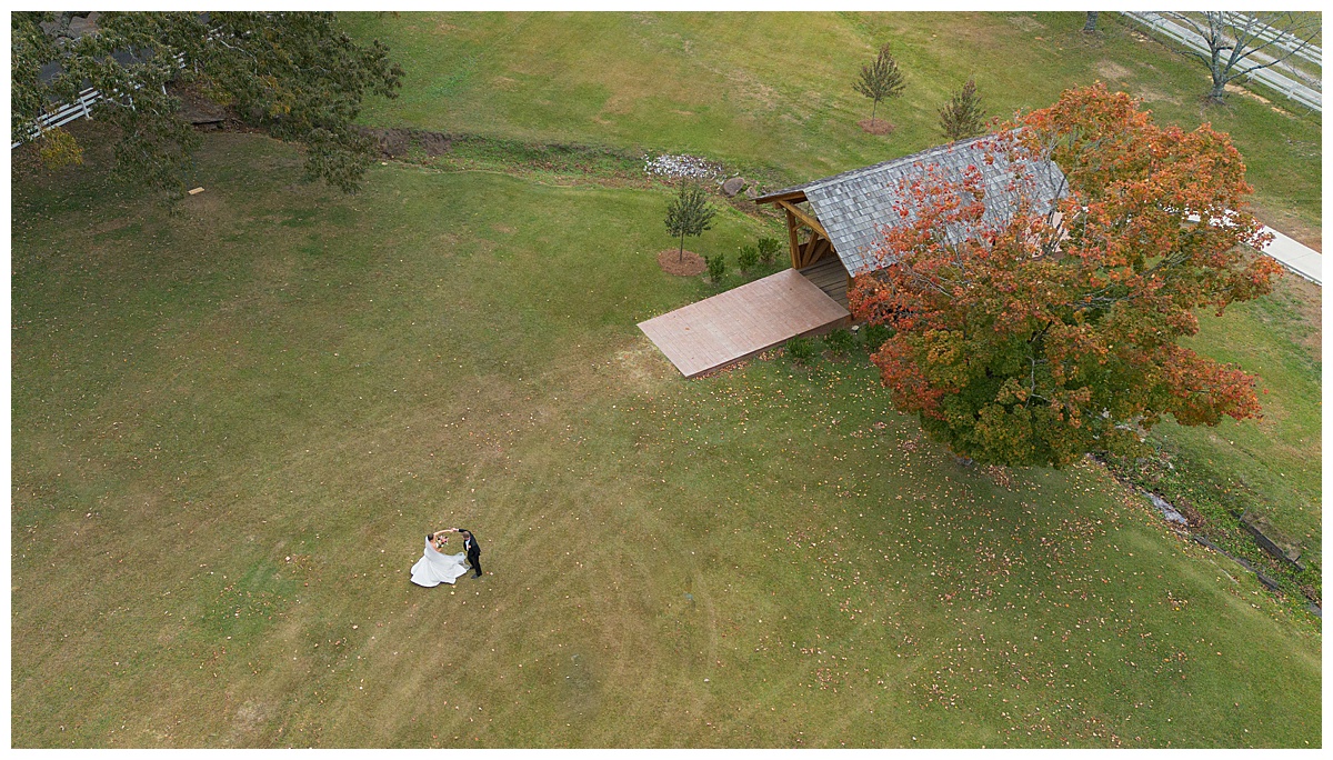 I showed up a bit early on the wedding day to capture some drone shots of the venue, and pulled it out again for Elizabeth and Alex’s portraits! I’ve been getting more confident with flying that little thing (and steering it away from trees, ha!), and Oris & Oak looked absolutely stunning from above. Seeing the whole property surrounded by fall color made the perfect backdrop for such a special day.